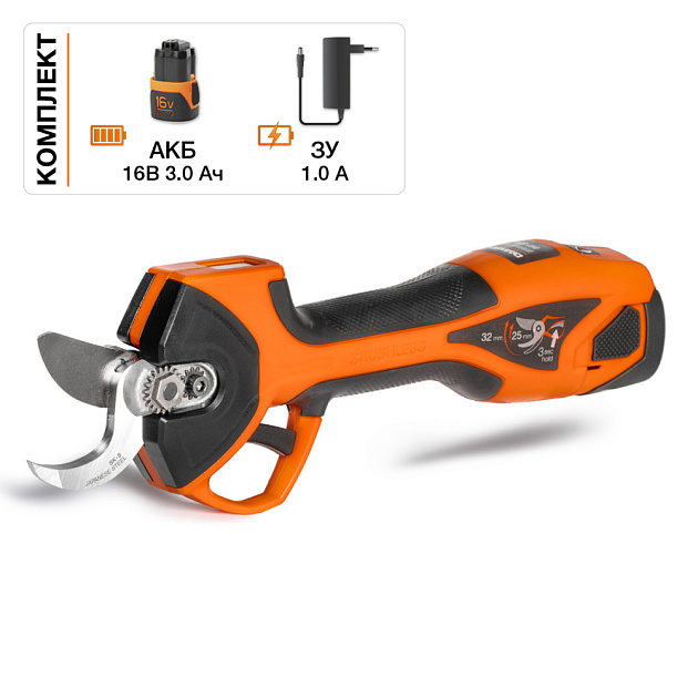 Мощный бесщеточный электродвигатель обеспечивает высокую производительность и долгий срок службы секатора.